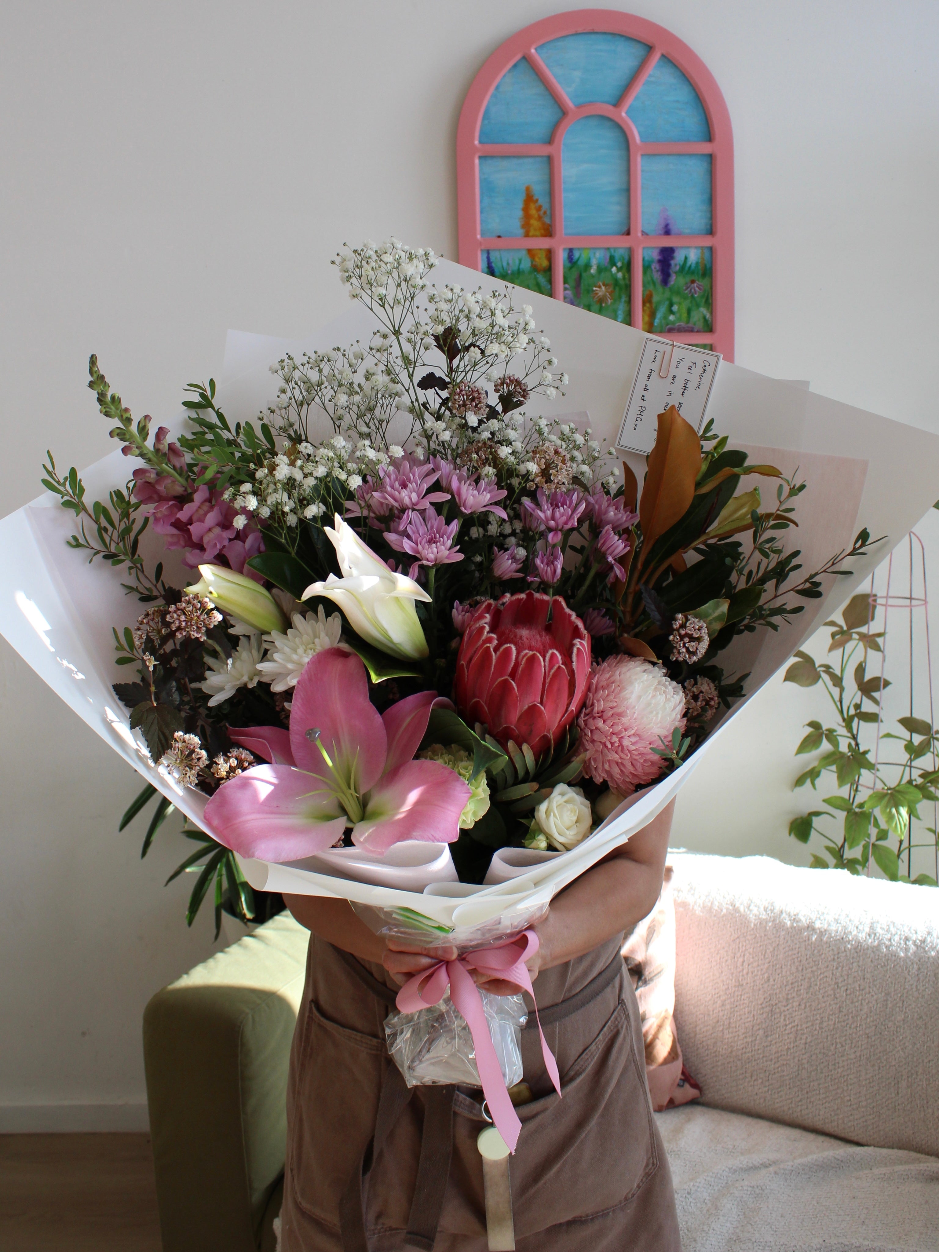 The Blushing bouquet, a classic beloved palette of soft tones, encapsulating the gentle beauty of pastel shades & femininity: guaranteed to leave your recipient blushing in awe.